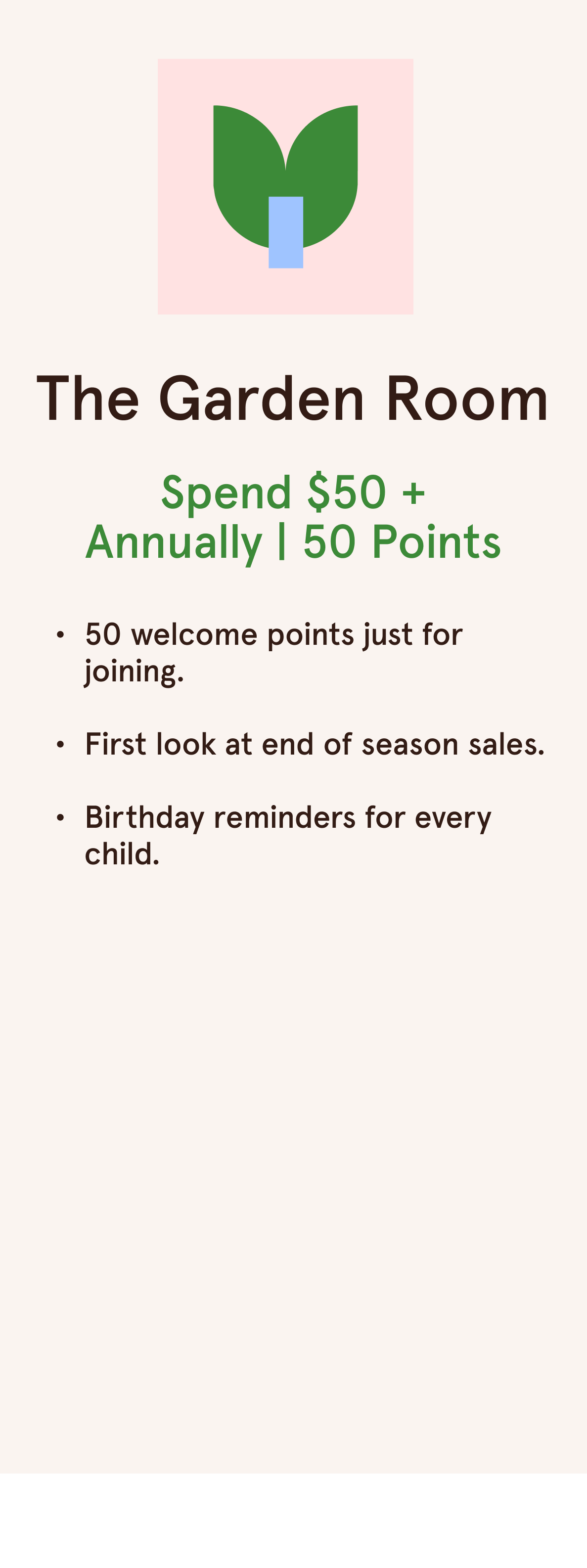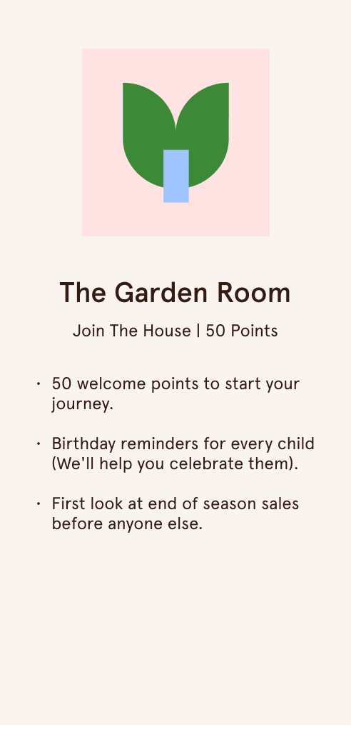 Start in The Garden Room with 50 welcome points, then unlock The Parlor, The Drawing Room, and The Sunroom as you shop.